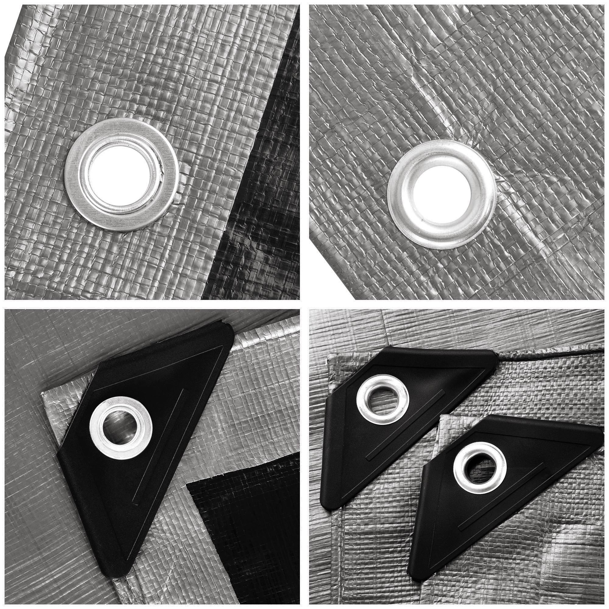 - Heavy Duty Sturdy Poly Tarp - Weights 8.11Lbs; 10mil heavy-duty thickness and aluminum grommets in 3 1/4 ft (1m) interval for better tear-resistance; PP plastics capped reinforced corners with grommets for sturdy construction; All seamless edges avoid water leakage