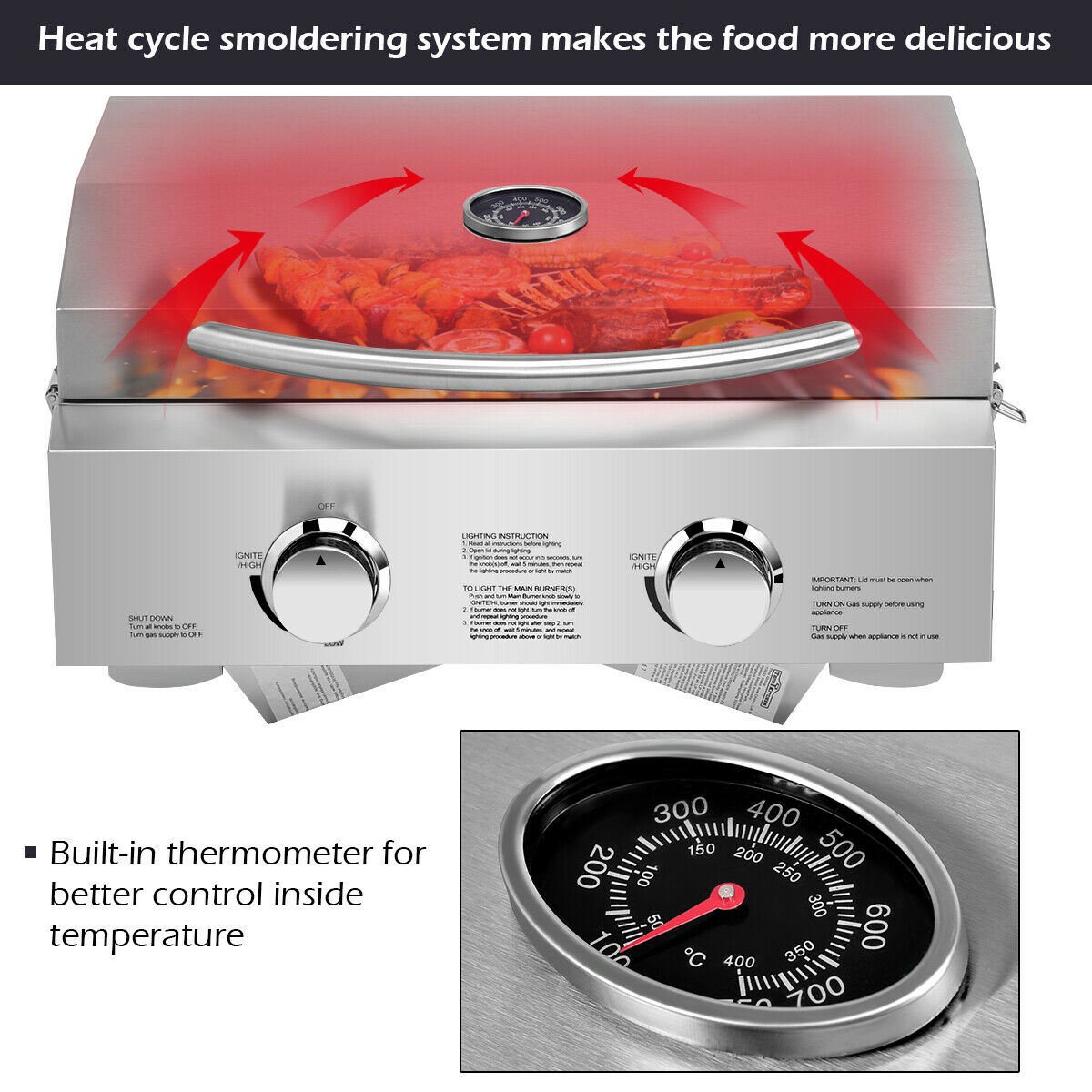 Our 2-Burner Stainless Steel Tabletop Grill is built for the BBQ-grillers on the go.Equipped with two push-and-turn ignition burners for quick and easy start-ups.It offers 20; 000 total BTUs and reaches high temperatures quickly with each burner independently adjustable.Featured foldable legs and lockable lid; make it more easily transportion or storage.It is perfect for dinner party and camping.With it; sit down and have a pleasant meal outside.You will enjoy your happy time.Two push-and-turn ignition burners for quick and easy start-upsFoldable legs and lockable lid for portable transport and storageBuilt-in thermometer; U can know the temperature with the precision430 Stainless steel construction offers durability and easy-to-clean surfacesCSA standard ApprovedPerfect for Tailgating; camping; picnics; boating or anywhere your travels take you