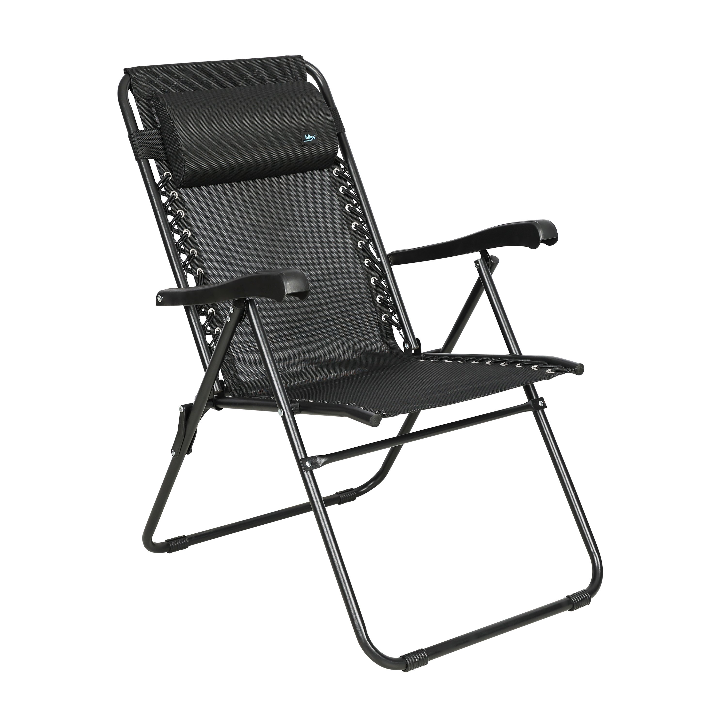 Enjoy the comfort of a reclining bungee chair with headrest. Built for relaxation and extended life; the seat fabric is made from vinyl-coated polyester; which is water and UV resistant so it won't fade and is super easy to clean and dry. The fabric is attached to the frame with double rubber bands; so it conforms to your body when you sit in it. The frame is sturdy and made of powder-coated steel so it's durable and holds up to 275 lbs. Also features a built-in headrest for added comfort. Use this chair indoors or out; including your patio; deck; or as a high-seat beach chair! Open dimensions of the chair are: 40.5" L x 24.4" W x 30" H; folded is 34.5" x 24.5" x 3.75".