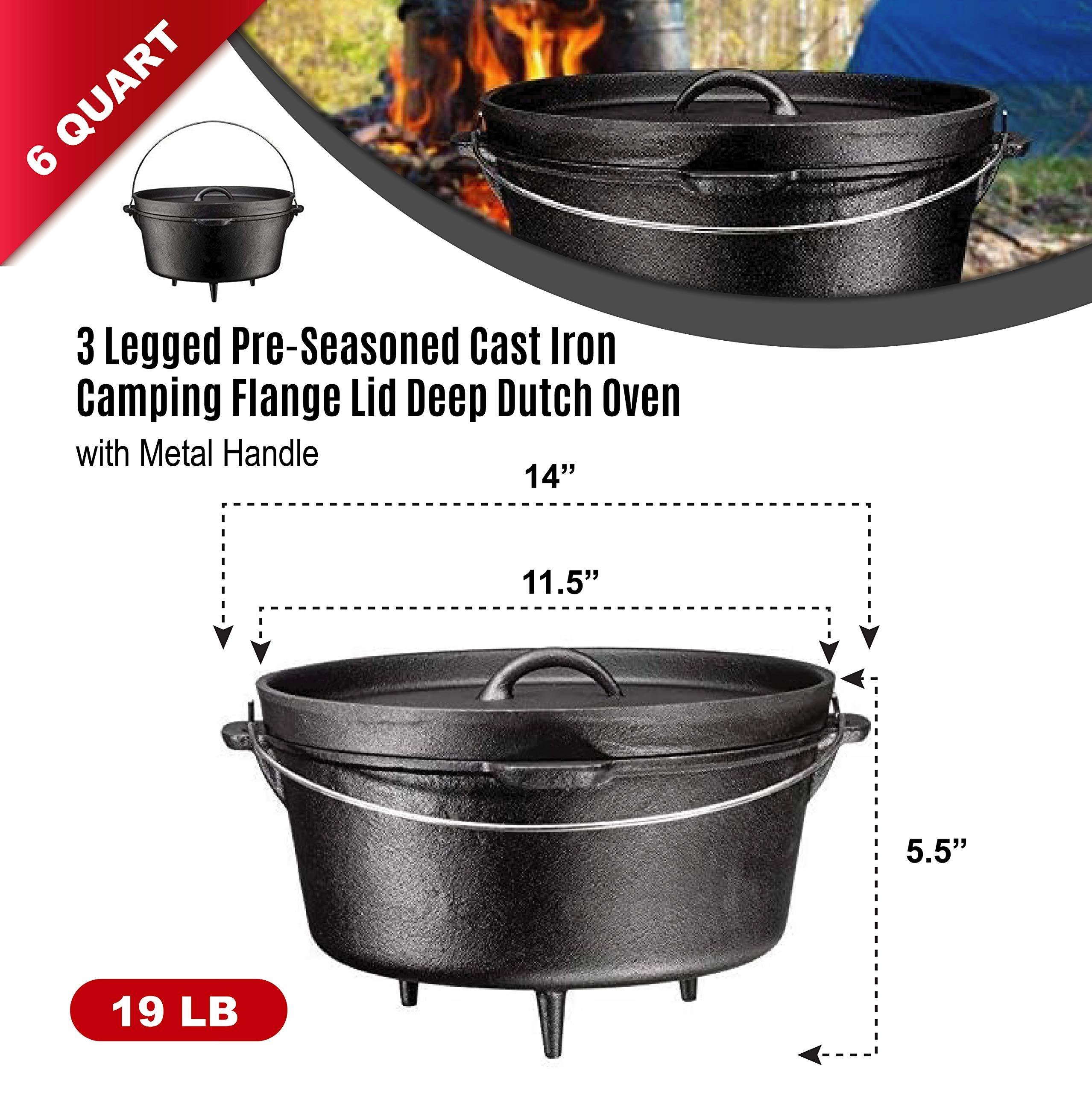 3 Legged Pre-Seasoned Cast Iron Camping Flanged lid Deep Dutch Oven; 6 Quart w/ Metal Bail Handle