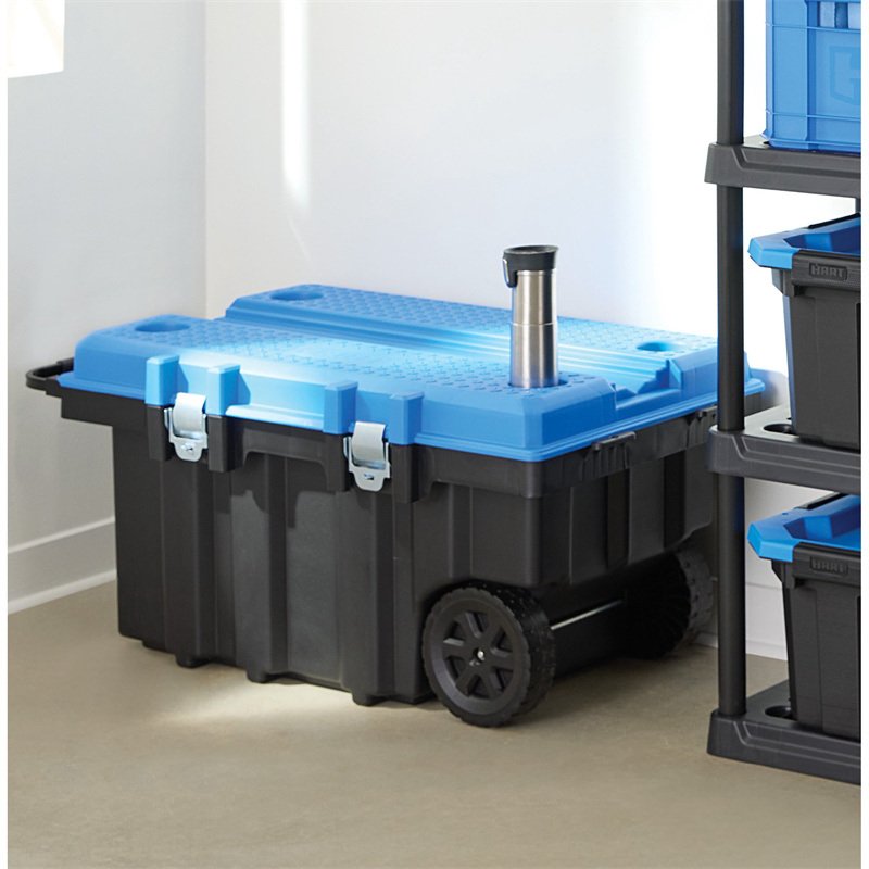 The 50 Gallon Heavy Duty Rolling Tool Chest in Black and Blue provides the ultimate in jobsite storage and functionality. The extra-large tool chest gives you a safe space to store your tools and equipment from dust; weather; pests; and pets. Keep your valuables safe with two aluminum latching locks. While on the go; the 2 feet by 3 feet lid also works as an extra workspace with built in saw grooves. The rear wheels and extendable handlebar make it easy to move around a crowded worksite; even though gravel; dirt; and debris. The 2"x4" saw groove work top has a molded in channel to rest lumber; pipes; and other materials for better leverage when cutting. The durable plastic construction is built to withstand tough conditions without peeling or breaking. When space is at a premium; the 4 built-in cupholder provides convenience you didn't know you need.Heavy-duty construction Provides durability for even the toughest JobsiteSteel locking latches Keep your tools safe & secureSaw groove top Provides extra 2’ x 4’ work surface & helps keep wood & other materials in placeDome lid Lets you maximize storage spaceSmooth finish Let you wipe away dirt & dust with a damp clothTie-down grooves Keep your tote in place while in the back of a truckWith recycled materialsDimensions: 43.1" w x 25.3" d x 20.6" h or 109.5 cm x 64.3 cm x 52.3 cmWeight: 33.5 lbs.Great for storing tools and other valuable items in a garage; shed; truck trunk; worksite and more.