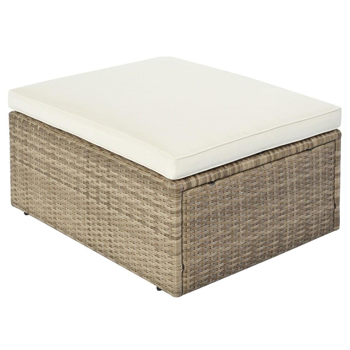 This outdoor sectional sofa set includes 2 corner chairs, 2 ottomans, 1 glass coffee table and 4 cushions as well as 4 pillows. The movable design allows you to freely combine the set and change to different shapes for seating or lying.
