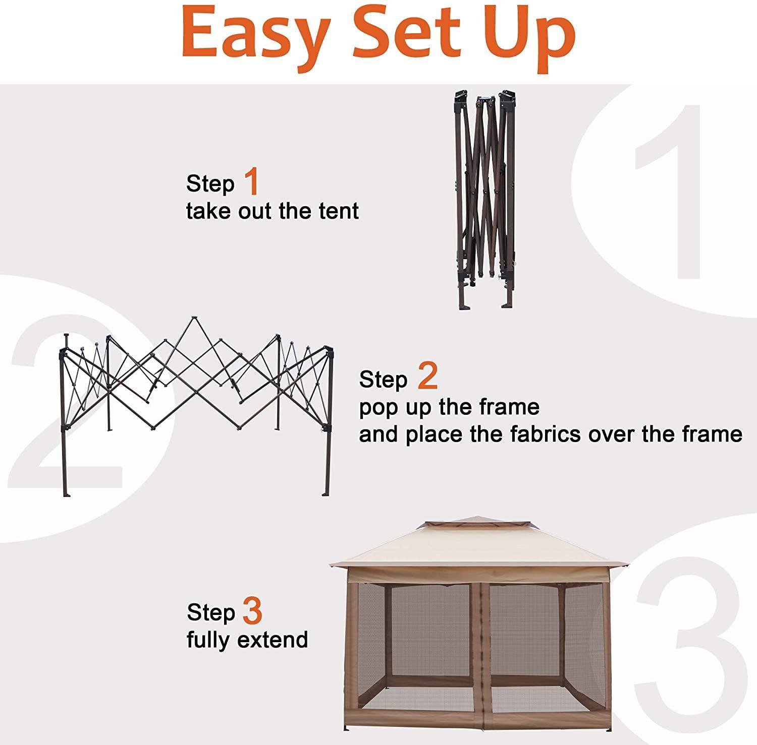 Easy Set Up - Tent overall size: 10.5' L x 10.5' W x 8.5' H; Weight: 35lbs; Only need 3 steps, pop up the frame then place the fabrics over the frame, fully extend and adjust the height, you can easily set up in minutes; It would be great if a friend installed with you together.