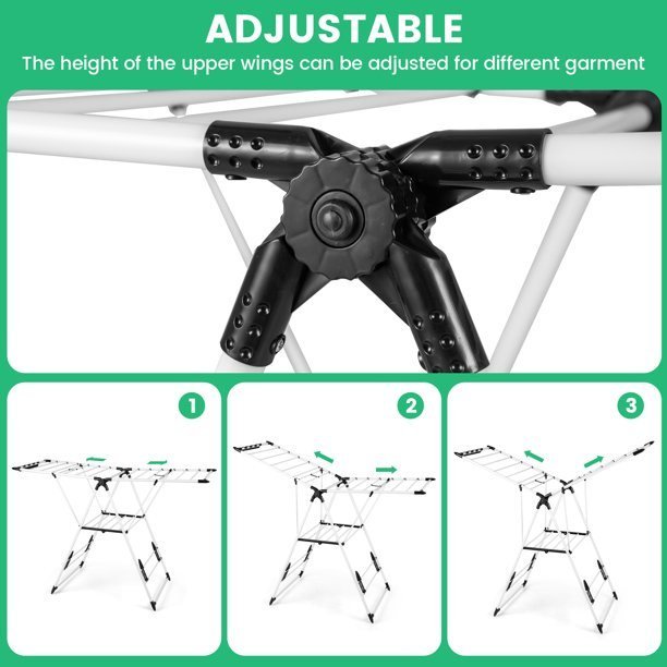 4.The support pole allows you to find the best position to dry your clothes. Plus, the adjustable wings allow you to hang a variety of clothing such as dresses, t-shirts, and sweaters.
