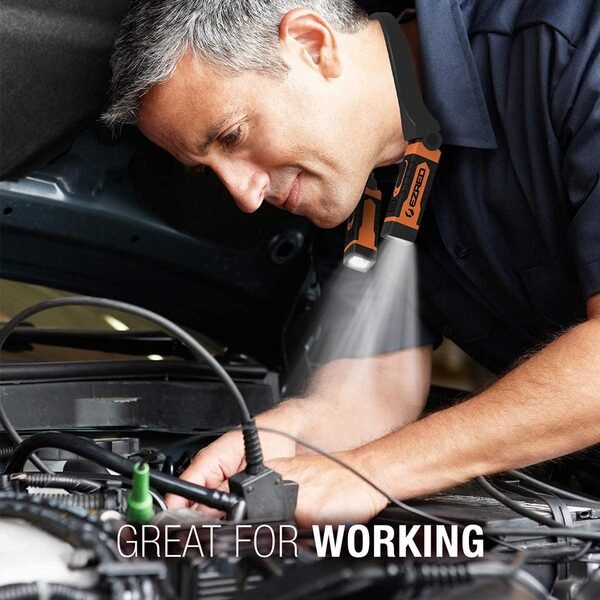 EZRED ANYWEAR Rechargeable Neck Light for Hands-Free Lighting (Orange) Allows you to work hands-free 200 lumens Dimmable Operate each light head independently Rests comfortably around neck USB-rechargeable with included cord HANDS-FREE / HASSLE-FREE: Innovative wearable design leaves you hands-free to work comfortably without irritation or stress to your forehead. This light rests on your neck without leaving sweat marks and can be easily cleaned. FOUR MODES FOR INFINITE USE: Whether you prefer the lowest setting (30 lumens) or the highest (200 lumens), this light adjusts to your power needs. Articulate the beams up and down by 90 degrees to create a wider beam. STYLISH AND COMFORTABLE: With its sporty design, this innovative light can be worn anywhere. Keep your hands free while working in the garage or on a project in the house. Have one ready to walk the dog or for when the power goes out. Stock up to take the family camping in safety. You will never run out of applications this light is perfect for. WATER-RESISTANT AND RUGGED FOR OUTDOOR USE: This light is IPX4-rated which means you can be sure your light stays on even when you are soaking in the rain. Made of a durable ABS nylon blend you can trust.