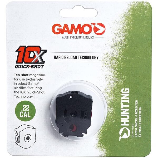 Gamo .22cal Gen 1 10X Quick-Shot Magazine Caliber: .22 Capacity: 10 rounds. Types: Multi-shot Magazine Fitting: The magazine designed for the Swarm Maxxim .22, Swarm Whisper .22, Swarm Bone Collector .22, Swarm Magnum .22, and other models with 10X Technology (NOT compatible with 10X GEN2 models). Empty magazine indicator High impact polymer case Number of shots left indicator Rotor numbered Smooth indexing Ammunition: Any .22 Cal. Pellet. Enables you to shoot up to 10 pellets without reloading simply break the barrel and shoot for lightning-quick follow-up shots This 10-shot magazine is rotor numbered, it has a smooth indexing, and is made of a high impact polymer base.