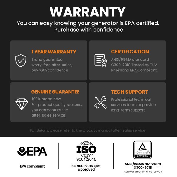 Features:*Dual fuel:Using gasoline; produces 3500W starting watts &3200running watts. Using LPG; produces 3100W starting watts &2800running watts. It can power air conditioners and many other small appliances such as refrigerators; coffee machine.*Environmentally friendly: LPG runs more environmentally friendly; quieter; cheaper; reduces vibration; extends engine life. Enjoy running time at 50% load up to 13.5 hours.*Multi-function display: easy to monitor voltage and frequency power; display remaining fuel; which is suitable for timely fuel change; display cumulative runtime; which is suitable for later generator maintenance; display unique runtime; perfect timer function.*Provide cleanpower: Inverter technology generates pure sine waves to provide safe; high-quality power for sensitive devices without affecting their useful life. Can directly charge phones; laptops; cameras and other digital devices*Protection:Carbon monoxide (CO) shutdown; and overload protection*Electric Start:Fast start technology; one-press only; 3 seconds to start-up*Multiple Outlets:2x 120V 20 Amp Outlets1x 120V 30 Amp Outlet2x USB Outlets*Parallelready:Double your power with parallel capability*Certified:EPA Certification&Passed the ANSI/PGMA Standard&ISO 9001:2015 certified.Specification:Running Watts: 3200W(Gas)/2800W(LPG)StartingWatts: 3500W(Gas)/3100W(LPG)Fuel Type: Gasoline/LPG25% loadRuntime: 11h(Gas)/24h(LPG)50% loadRuntime:6.5h(Gas)/13.5h(LPG)Starting System: Recoil Start/Electric StartRunning Amps: 26.7A(Gas)/23.3A(LPG) Peak Amps: 29.2A(Gas)/25.8A(LPG)AC voltage: 120V AC Frequency: 60hzFuel Tank Capacity: 1.6Gal Oil Capacity: 0.12GalEngine Type: 4-stroke; OHV; air-cooledEngine Displacement: 145ccOil Type: 10W30Volume Level (23 Feet): 62dBNet Weight: 55lbsGenerator Size:20.9×12.2×19.9Inch (L*W*H)Note:1. Applicable altitude: areasbelow 5000ft. More than 5000ft will affect its stability and power.2. Optimum working ambient temperature of generator: 77 ℉. Normal working temperature:5 ℉to 104 ℉.3. Please make sure the engine is filled with full oil(add oil to the thread) before every starting; otherwise it will fail to work