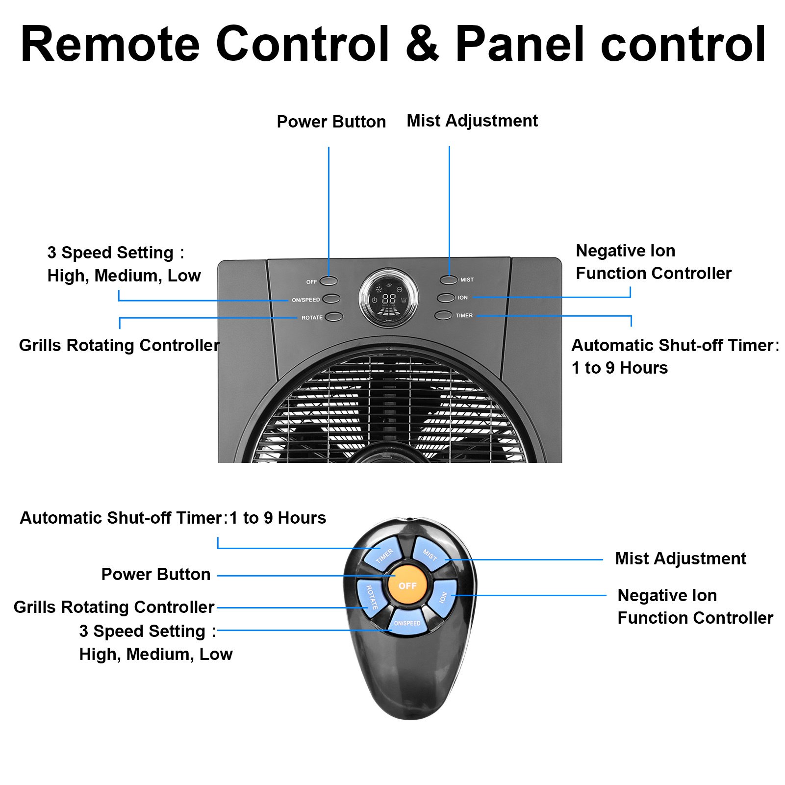 FAN AND HUMIDIFIER FUNCTION: The fan and humidifier can be used together to cool the air in summer or used only as a humidifier in winter to keep your environment comfort.LARGE WATER TANK: The fan is designed with a 2.5L water tank. It can function between 18 and 30 hours. The capacity of the large tank will set you free from adding water repeatedly during the night.AUTO SWITCH OFF TIMER: The fan and the mist function will automatically turn off after the time set on the timer. The time can be programed from 1 to 9 hours.NEGATIVE ION FUNCTION: Negative ion will refresh the air by bring down positive ions to the ground. This will help to purify the air.PHOTOCATALYST FUNCTION: Made of semiconductor materials with photocatalytic function; it has the function of efficiently purifying the air; providing you with a fresh and healthy environment.