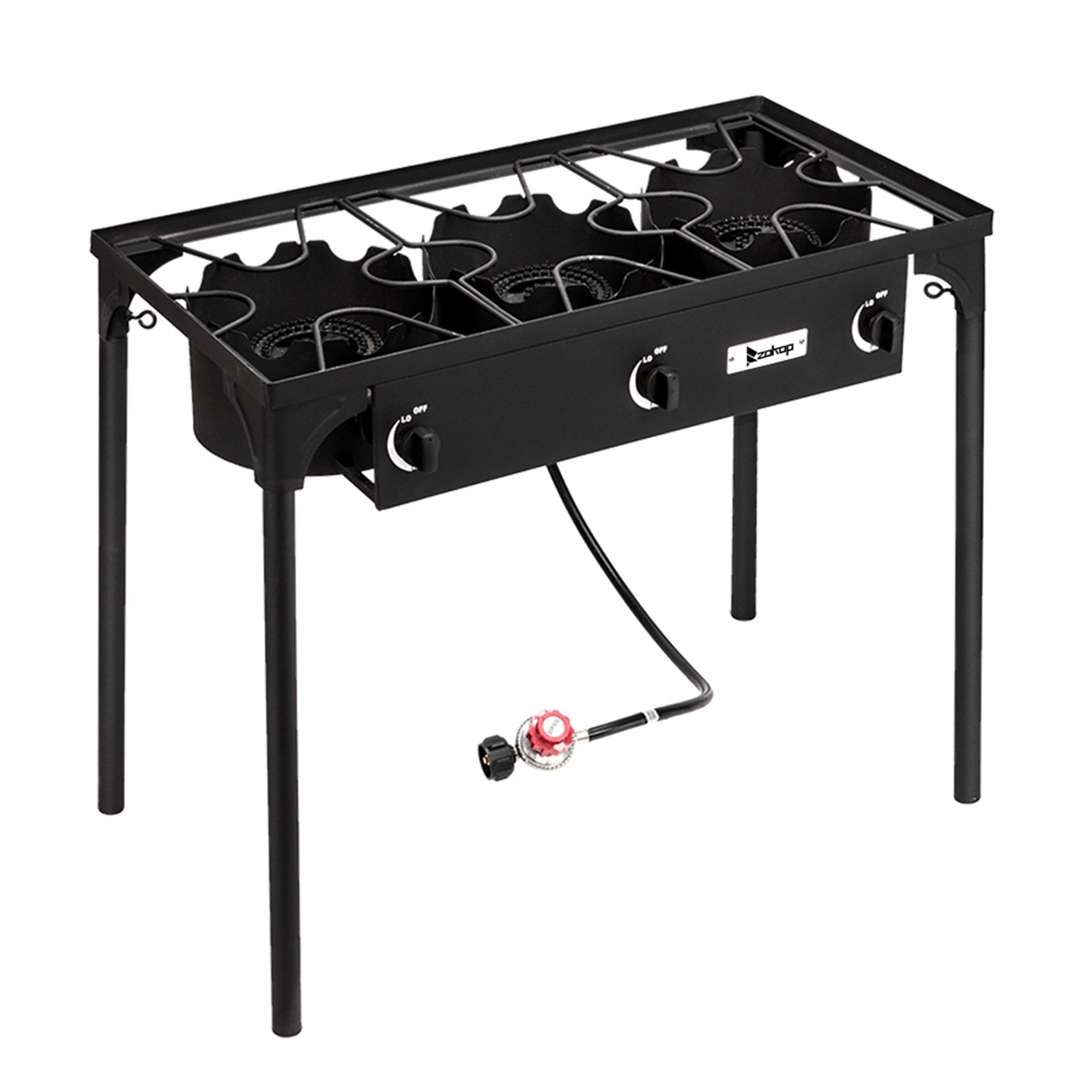 Introductions:This powerful three burner, equipped with a cast iron head, outputs a whopping BTU of 225000. And it can adjust the firepower to make your cook more delicious. It is suitable for various types of pot because of burner bracket. So you can enjoy cooking outdoor with your family to have a happy time. Do not hesitate, just buy it.Features:1. High-pressure three burner camp stove, sturdy and durable design, made of cast iron long lasting and good for projects2. 225000 BTU of cooking power3. Ultra-portable with removable legs4. CSA listed regulator certified by CSA5. 0-20 psi adjustable make cook faster and cleaner than other standard propane burners6. Perfect for camping, fishing, parties, tailgates hunting and home brewingSpecifications:1. Product Type: Three Burner2. Material: Cast Iron3. Burner Diamter: 10.24" / 26cm4. BTU: 2250005. Brand: ZOKOP6. Furnace Head Diameter: 5.51" / 14cm7. 1.2m Leather Tube Included: Yes8. Dimensions: (34.25 x 17.72 x 29.72)" / (87 x 45 x 75.5)cm (L x W x H)Package Includes:1 x Three Burner Stove1 x 0-20 Psi Regulator1 x Instruction