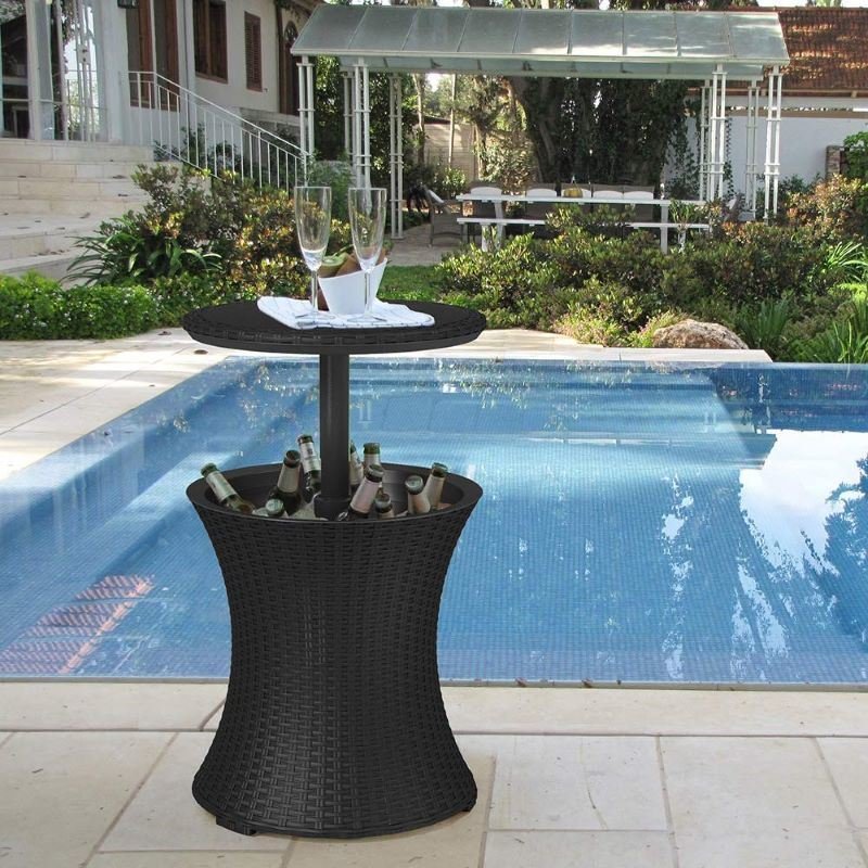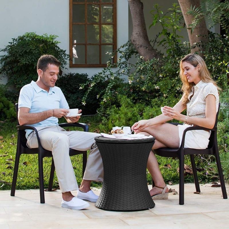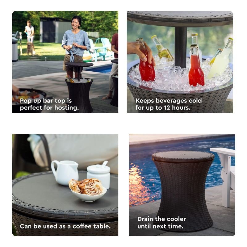 POP UP BAR & HIDDEN COOLER: Lid elevates upwards 10 inches above the rim for use as a patio bar table. The top reveals a hidden cooler with 7.5-gallon capacity. Keep up to forty 12 oz. cans ice cold.