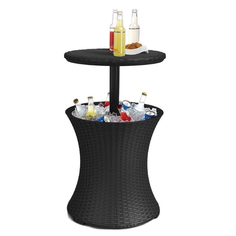 2.Lid elevates upwards 10 inches above the rim for use as a patio bar table. The top reveals a hidden cooler with 7.5-gallon capacity. Keep up to forty 12 oz. cans ice cold.