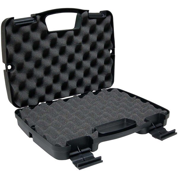 SE SERIES SINGLE PISTOL CASE High-density interlocking foam Contoured recessed latches Strong, rigid ribbed construction Padlock tabs for added security Comfortably accommodates pistol and accessories Dimensions: L=13.5in. x W=10.13in. x H=3in. Color: Black