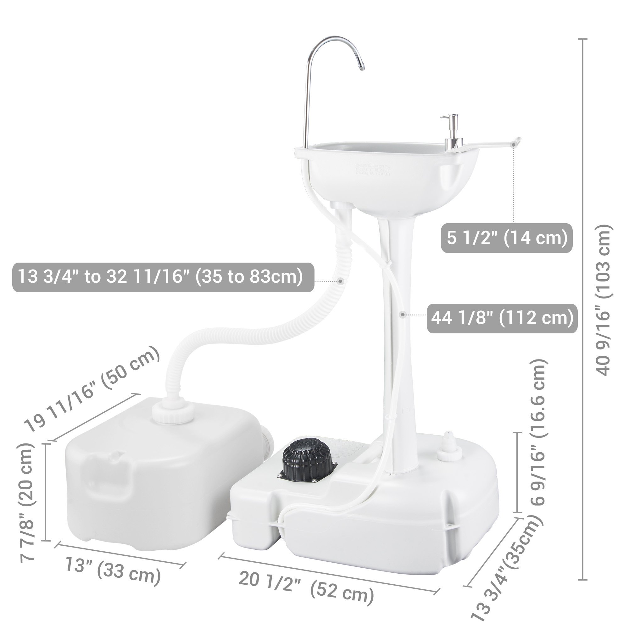 - Base Tank Dimension(LxWxH): 20 1/2" x 13 3/4" x 6 9/16" (52 x 35 x 16.6 cm) - Wash Basin Internal Dimension(LxWxH): 10 1/4" x 7 7/8" x 3 15/16" (26 x 20 x 10 cm) - Waste Water Tank Dimension(LxWxH): 19 11/16" x 13" x 7 7/8" (50 x 33 x 20 cm) - Inlet Water Pipe Length: 3 2/3 ft (112 cm) - Draining Pipe Length: 13 3/4" to 32 11/16" (35 to 83 cm) - Foot Pump Weight Capacity: 440 Lbs (200 kg) - Material: New HDPE - Base Tank Capacity: 17 L - Waste Water Tank Capacity: 24 L - Soap Dispenser Capacity: 3 L - Total Net Weight: 11.5 Lbs (5.2 kg)