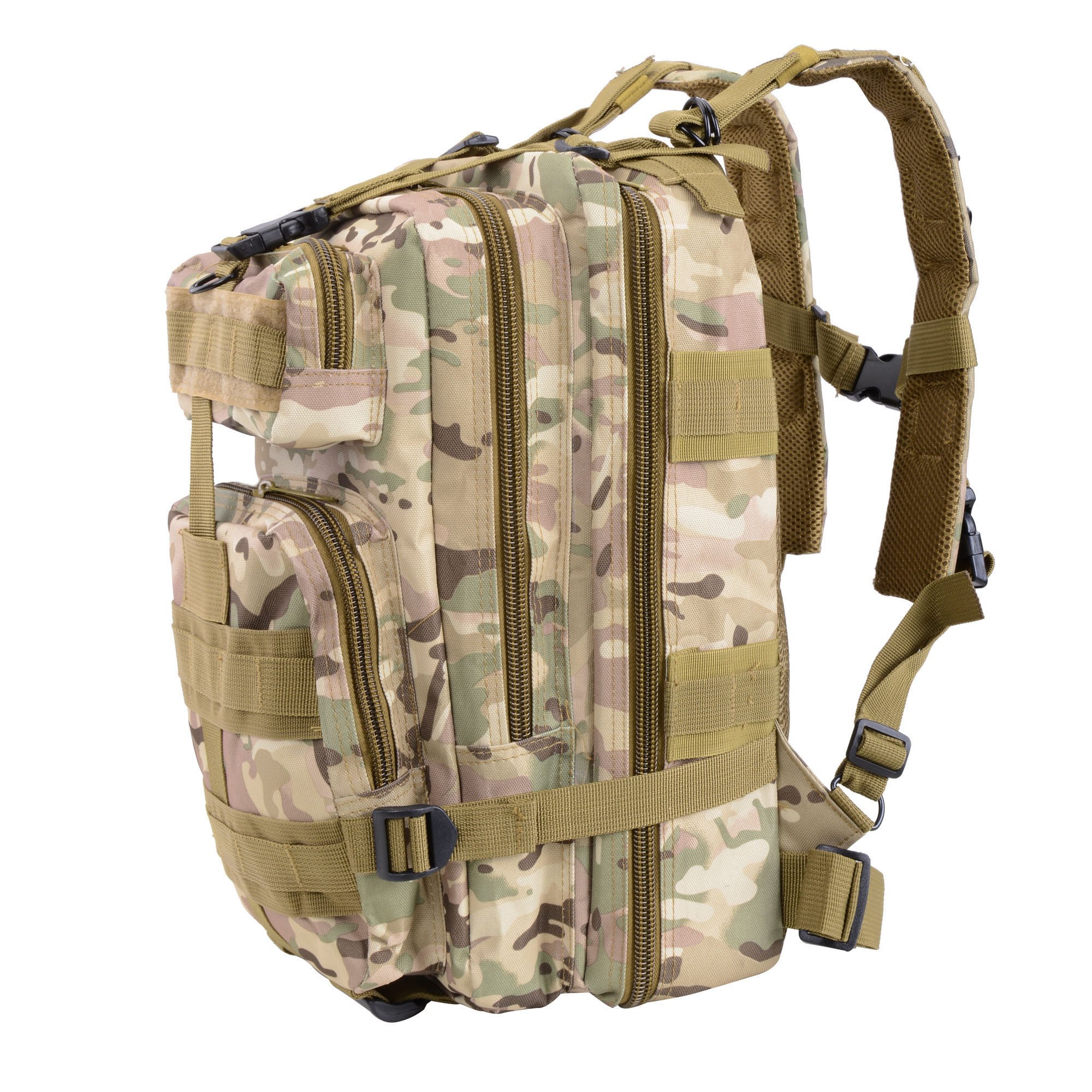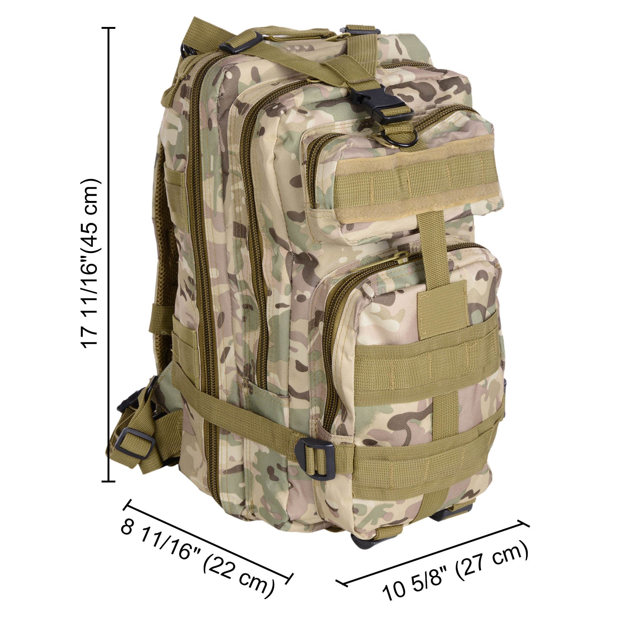 Large Capacity & Multiple Pockets - 17" x 10" x 8" CP Camouflage Military Molle Tactical Backpack with 28 L large capacity; features 2 zipped large compartments with 2 front pockets & inner pockets; better organize and hold all your outdoor gears in a bag; ideal for mountaineering; hiking; camping; travel; jungle adventure and other sports activities