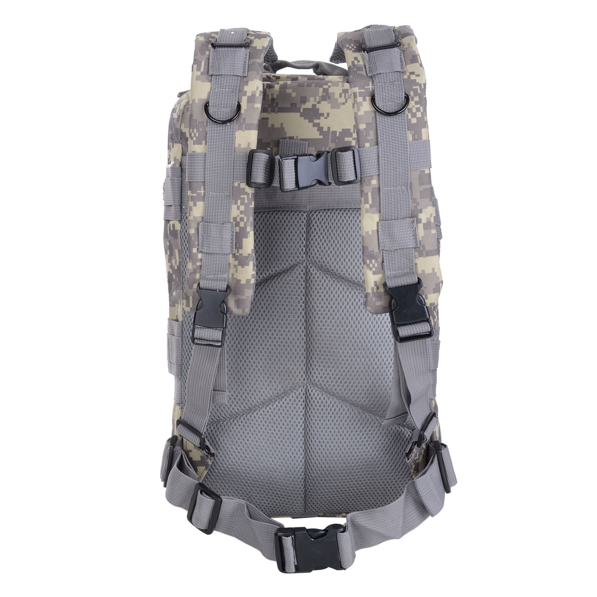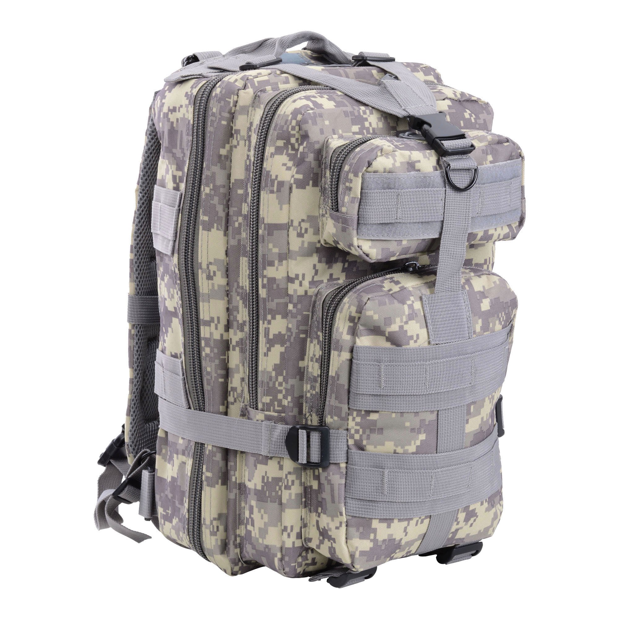 Large Capacity & Multiple Pockets - 17" x 10" x 8" ACU Camouflage Military Molle Tactical Backpack with 28 L large capacity; features 2 zipped large compartments with 2 front pockets & inner pockets; better organize and hold all your outdoor gears in a bag; ideal for mountaineering; hiking; camping; travel; jungle adventure and other sports activities
