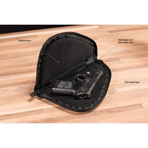 Medium Handgun Case External Dimensions: 13"e; W x 7"e; H x 1.5"e; D One compartment Perfect for transporting or storing individual handguns Padded walls for protection OUTSIDE: Full length zipper for easy access